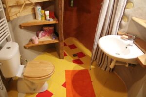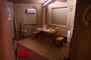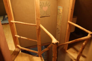 Domek je dvoupatrový, nahoře jsou dva oddělené pokoje, schody do přízemí se zábradlím z přírodního akátu, aby i ve tmě byla chůze po schodech bezpečná. Dole je pak místnost na cvičení, kuchyňka, stůl a židle na sezení a koupelna. Teplá voda může zapáchat (minerální voda s obsahem sirovodíku) podobně jako např. v léčivých lázních Smrdáky :).